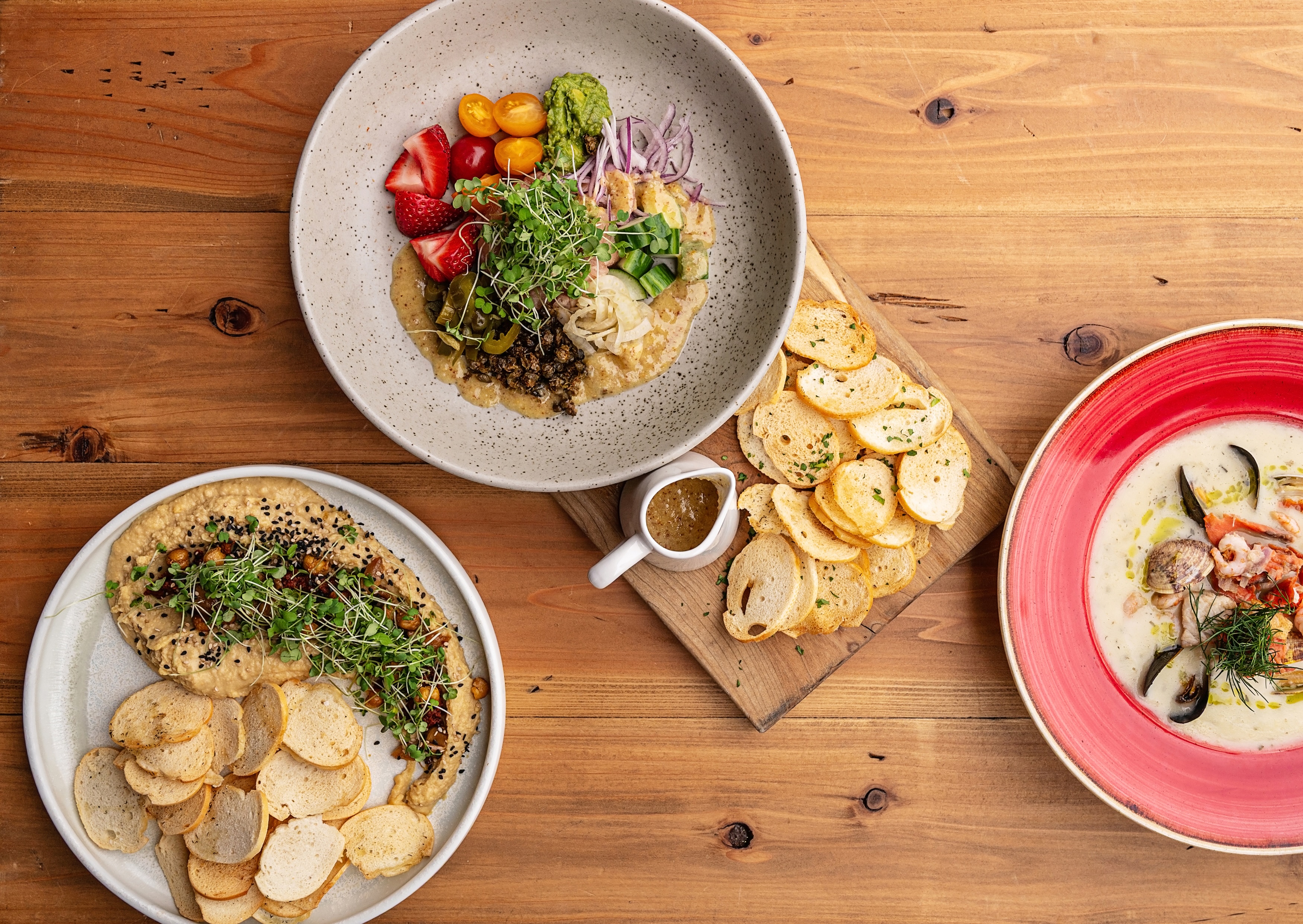 confit garlic, sun-dried tomato pesto, tahini, sesame, vegetable crudités, house-made crostini